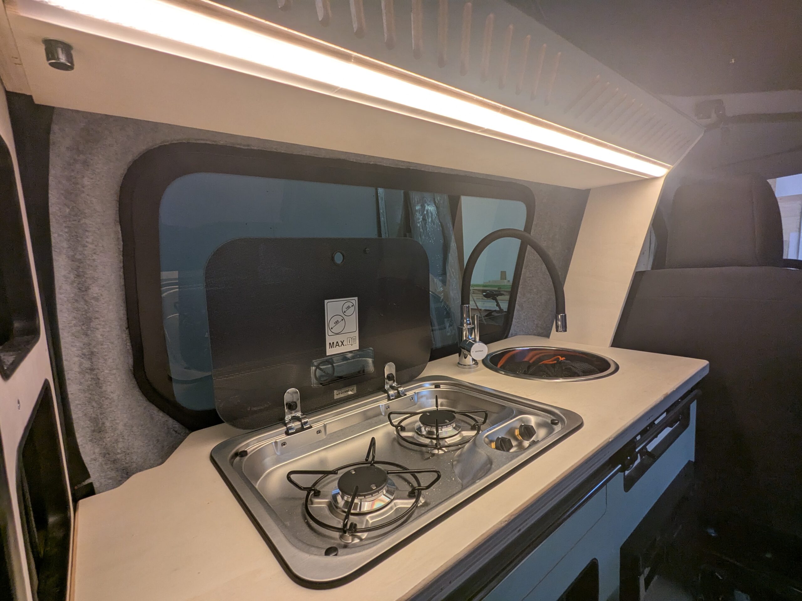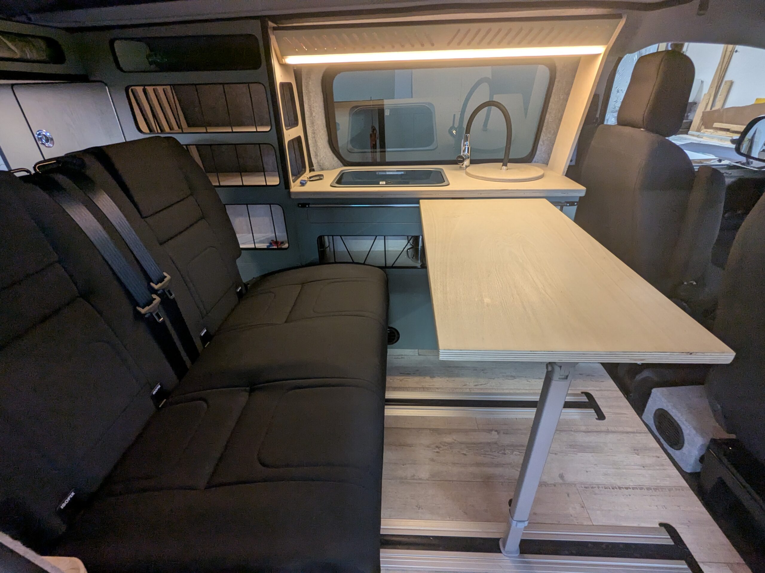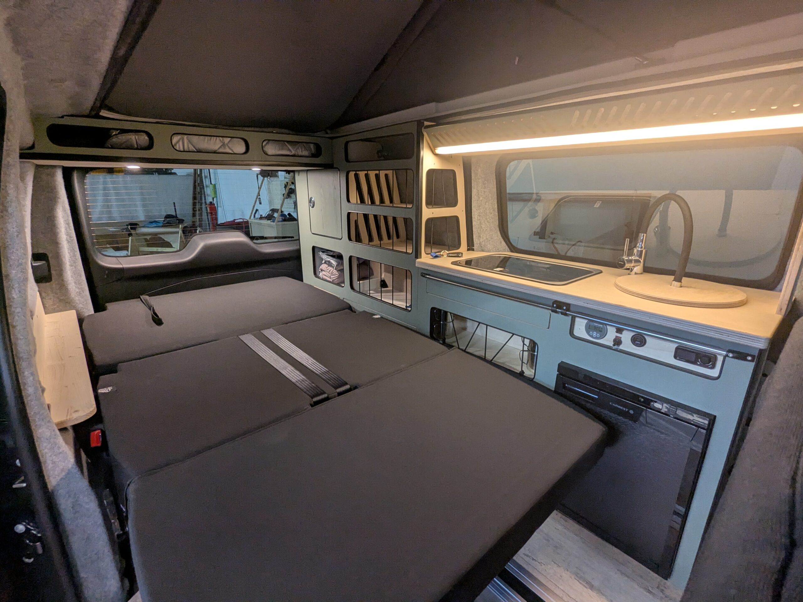 - Cuisine équipée (2 feux gaz, petit évier et son robinet, nombreux rangements astucieux, tablette extractible, mini table porte gobelet donnant accès à un double fond…)