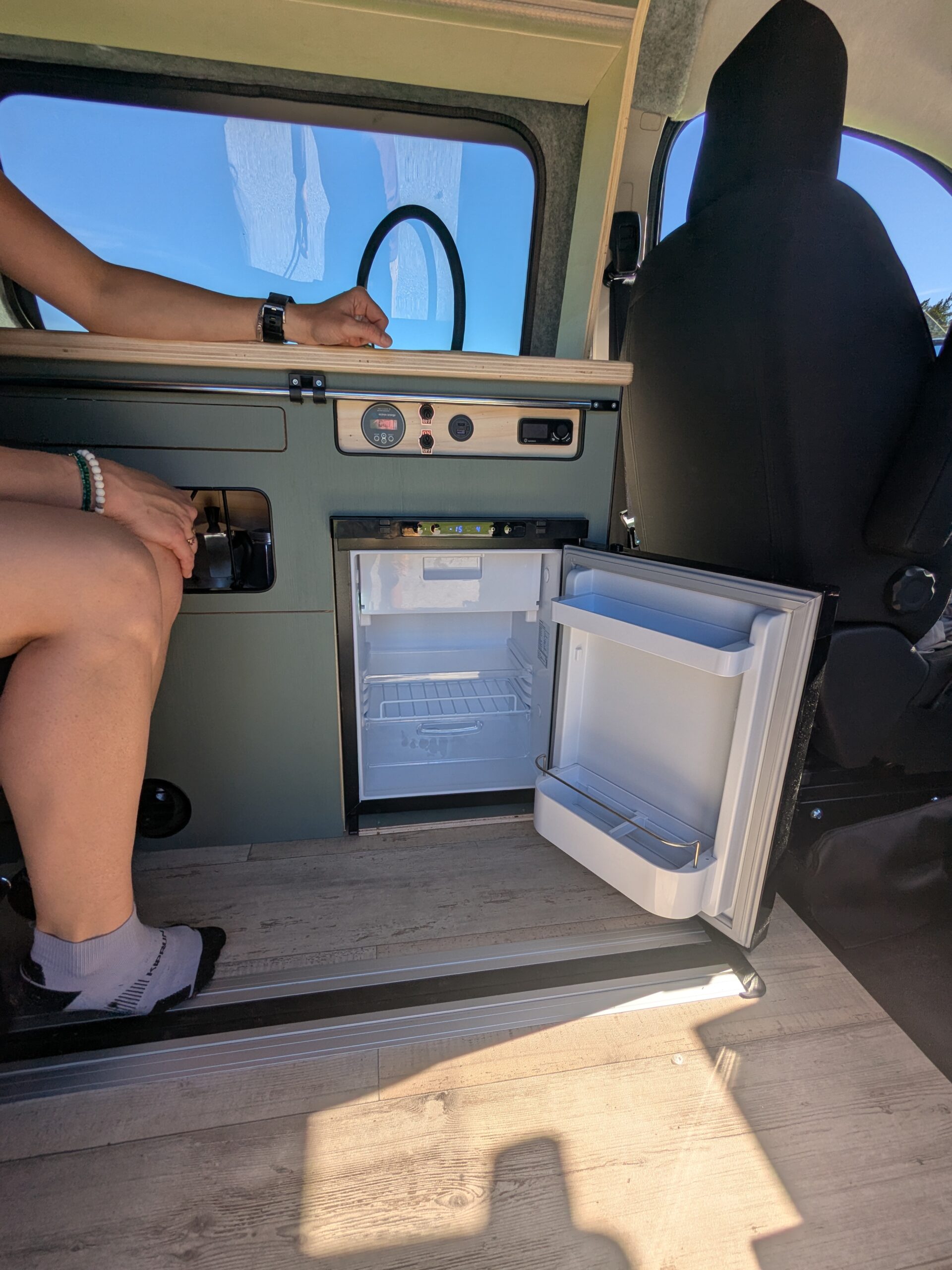 - Frigo à compression de 40L (qui fonctionne largement sur énergie solaire, ou sur batterie quand le soleil ne se pointe pas)
